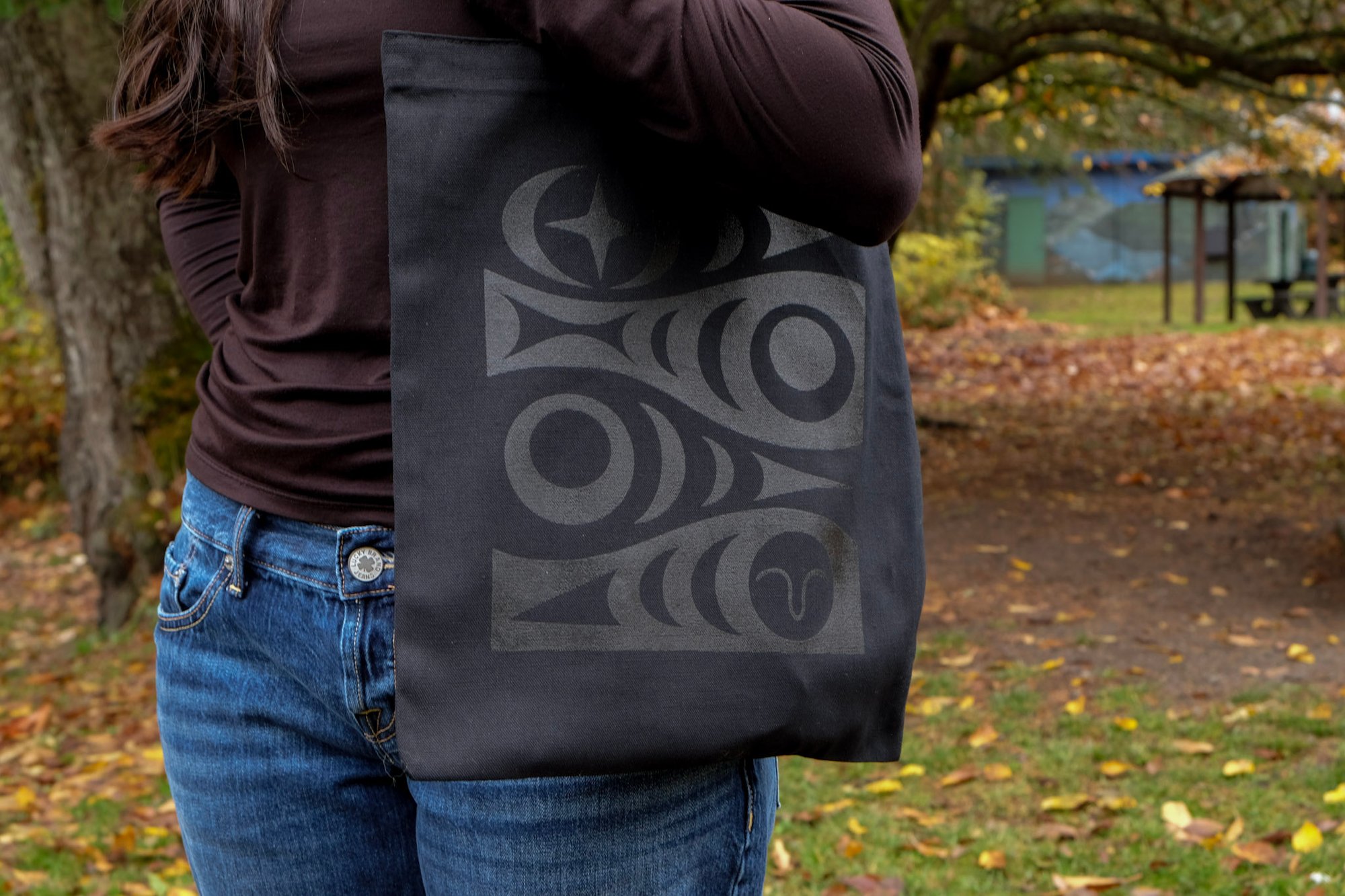 100% heavy canvas, 12 oz. 20” web canvas handles. 14"W x 16"H. Hand printed in Nanaimo by Mauro Dalla Costa/UFF Screen Printing.